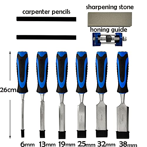 6mm, 13mm, 19mm, 25mm, 32mm and 38mm chisels, perfect for the beginning woodworker or for those who need to replace or upgrade their current equipment.