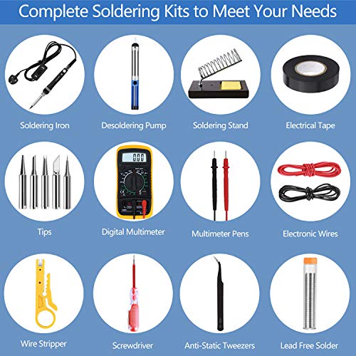 - COMPLETE SOLDERING IRON KIT:soldering kit comes with a 60W temperature controlled soldering iron with ON/OFF switch, digital multimeter, 2 multimeter pens, 5 soldering tips, stand, cleaning sponge, desoldering pump, solder wire, tweezers, screwdriver, wire stripper cutter, insolation tape, 2 electronic wires, PU carry bag and manual. Perfect choice for beginners, professional users and hobby enthusiast.
