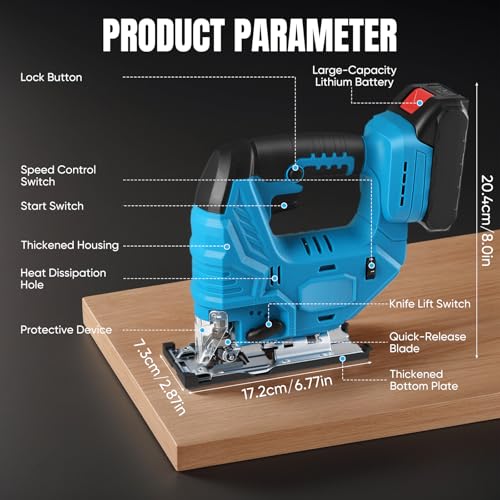 - DURABLE & STURDY CONSTRUCTION: Crafted with a robust metal body and a solid base, this cordless jigsaw with battery ensures exceptional stability and precision during operation. The rubberized handle reduces vibration, enhancing comfort and control for extended use. The transparent dust cover design prevents dust and debris from entering the cutting surface, providing you with a better view and a more comfortable work environment.