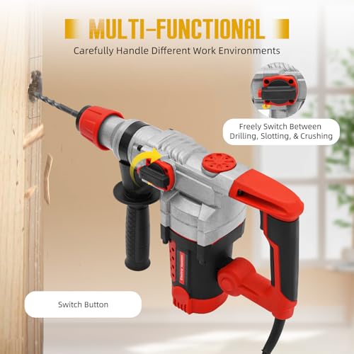- ✅【Multiple Applications】This professional hammer drill can be used for drilling, grooving, hammering, chiselling, etc. of concrete, brick, cement, etc., with one-click switching of various functions.