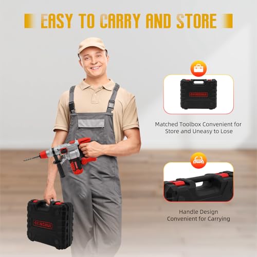 - ✅【Easy to Use】One-button quick adjustment. The electric hammer button is simple, and the working mode can be adjusted with a little adjustment. Tool set includes not only this impact drill with SDS-Plus holder, but also 4 drills, 2 chisels, a pair of gloves and various accessories, all packed in a case.