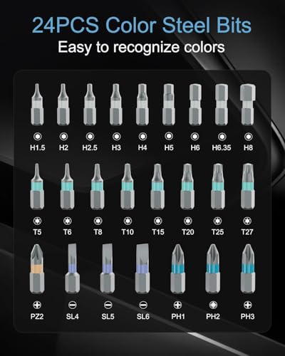 - 【24 Professional Bits】The 24 in 1 magentic screwdriver set includes a wide range of bits, catering to 5 types of screws, includes PH000-PH2 Phillips, SL1.5-4.5 Flathead, T3-T6 Torx, H0.7-H3 Hex and moreFrom Phillips to flat – head, Torx to hex, it provides all the necessary bits for different repair needs