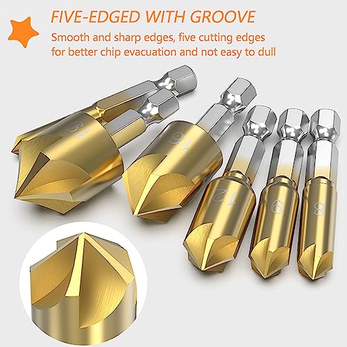 6Pcs Hss Countersink Drill Bit Set with 5 Flute 82 Degree Center Countersink Bits 1/4" Hex Shank Chamfering Drill Bits for Wood Quick Change Bit 6mm-19mm