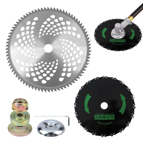 - Professional-Grade Brush Cutter Blades – a 9" 20T chainsaw blade for cutting thick brush/small trees (up to 3" diameter) and a 10" 80T carbide-tip blade for dense weeds/woody shrubs. Compatible with Stihl, Weed Eater, Husqvarna, Echo, and other straight-shaft trimmers (1" arbor).