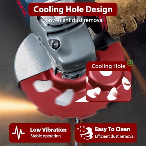 - 【Cooling Holes】 This angle grinder wheel features cooling holes that not only dissipate heat and easily remove grinding dust, but also effectively prevent vibration during grinding, minimizing damage to the machine and extending the life of the machine and diamond grinding disc.