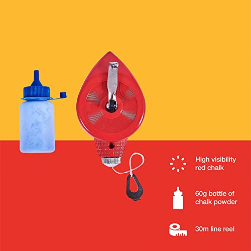 - CHALK INCLUDED: The lightweight aluminium body encloses 30m (100ft) of self-chalking line reel and is supplied with a 50g bottle of high visibility chalk powder