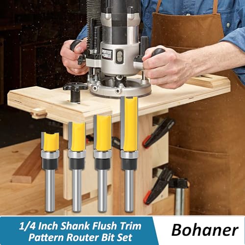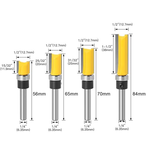 - Product Packaging: 4 Piece Flat Tip Trimming Router Bits; 1/2" Bearing Diameter, 1/4" Shank, Widely Used in Handheld and Benchtop Portable Routers
