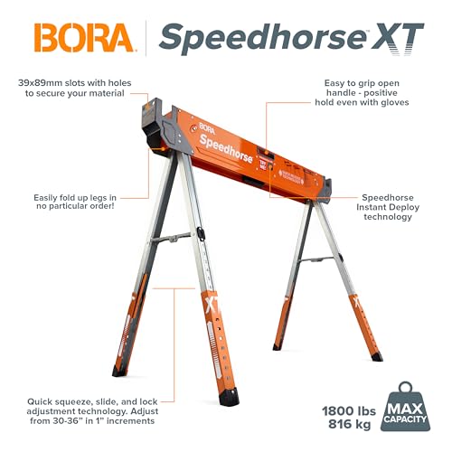 - 1.6 Second Set-Up: The BORA Speedhorse XT is part of the BORA Speedhorse family, which are the only sawhorses on the market with lever quick-release deploy technology, offering instant setup and teardown that is 30x faster than conventional sawhorses