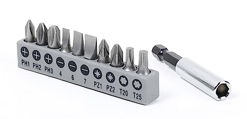 - 10x screwdriver bits 25 mm (3x Cross-Head PH 1/2/3, 2x Pozidriv PZ 1/2, 3x Slot Head S 4/6/7, 2x Torx T 20/25), 3x nusetters Ø 7/8/10 mm, 1x magnetic universal holder, 1x countersink Ø 12.7 mm