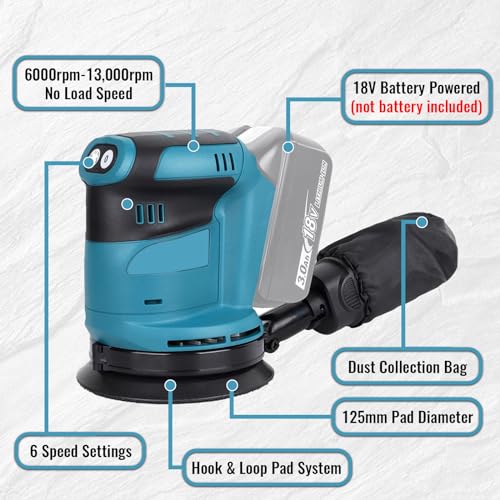 Brushless Orbital Sander Compatible with Makita 18V Battery, Cordless Random Orbital Sander with 12Pcs Sandpapers, 360°Rotating Sanding, for Sanding, Polishing Metal/Wood (Tool only,no Battery)