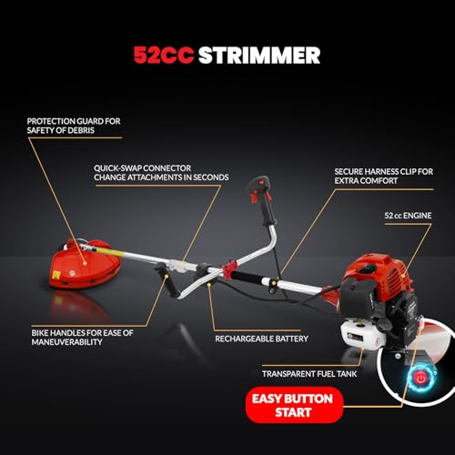 - Dual-Start System – Electric Push Button & Pull Cord – Start your tool effortlessly with the electric push-button ignition or use the traditional pull-start for reliability. A powerful 2stroke petrol strimmers 52cc engine ensures high performance for all garden tasks.