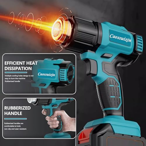 - 🏆【Cordless Heat Gun】The size of the cordless heat gun is 6.5in*8.07in, after pressing the safety button and on/off button at the same time to activate the heat gun, you can adjust the temperature you need.The rechargeable heat gun for 18V batteries has efficient and fast heating function. It is equipped with dual heating wires that reach a maximum temperature of 932°F (500°C) in just 2-3 seconds. The power tool heat gun features a high-quality aluminum oxide ceramic heating core that ensures fast and consistent heating. It also features an all-copper motor that lasts up to 80% longer than other models.