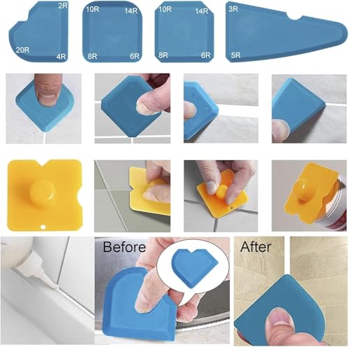 - 【What You Get】The caulking tools can use for home, kitchen, bathroom, window, sink joint, tile and so on. You will get 1x upgraded 5 in 1 caulking tool, 1 x sealant cover, 1 x black removal scraper, 4 x different shapes caulking scraper, 6 x different models silicone pads