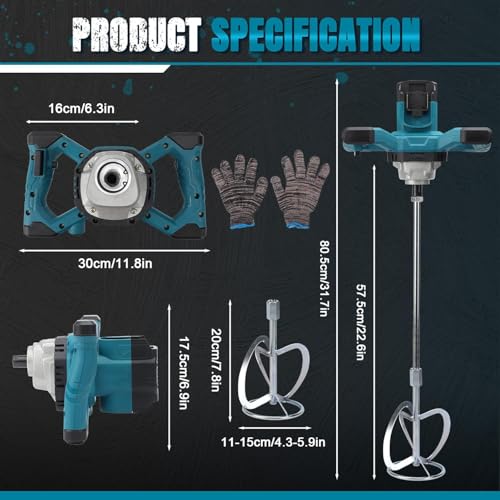 - 【Thickened Stirring Rod】: This paint mortar mixer's gearbox is made of lightweight and sturdy aluminium alloy. Powerful 3100W concrete mixer with efficient exhaust system. A built-in cooling fan and dense cooling holes dissipate heat on time. Equipped with S stirring rods+W shaped mixing head for building materials