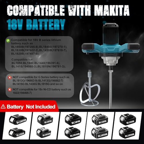 - 【Cordless Cement Mixer】 : This electric cement mixer is no longer limited by wires, making it more convenient for a wider range of applications. It is compatible with Makita 18V batteries such as BL1830, BL1830B, BL1840, BL1840B, BL1850, BL1850B, BL1860B. it is not compatible with G-Series batteries and Ni-CD batteries. (Note that the battery and charger are not included in the package)