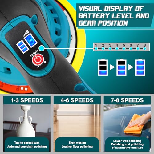 - POWERFUL & HIGHER POLISHING EFFICIENCY — This polisher has a built-in high-efficiency Brushless Motor, low noise, power, enhanced performance which can provide a maximum speed of 5500 RPM. The cordless polisher can help wax spread evenly to prevent over-polishing and paint wear.