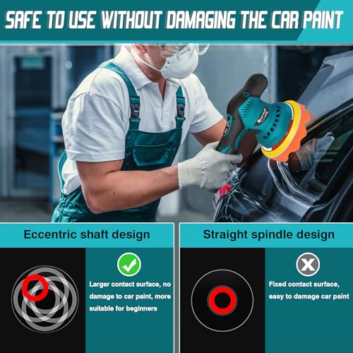 - HUMANIZED DESIGN — The car polishing machine adopts an ergonomic handle design with rubber coating, which makes it more comfortable to hold and reduces noise and vibration. The eccentric polishing movement of the polishing disc with an irregular oval rotation distance of 12mm is easy to use and suitable for beginners and will not damage the car paint.