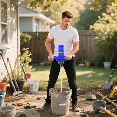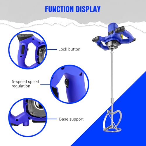 - 【Ergonomic Handle】 – The double handle design on the left and right sides gives this concrete stirrer greater stability and manoeuvrability. The ergonomically designed handles are comfortable to hold and reduce fatigue during prolonged use. It also has a locking button so you don't have to keep pressing the trigger when using the machine.