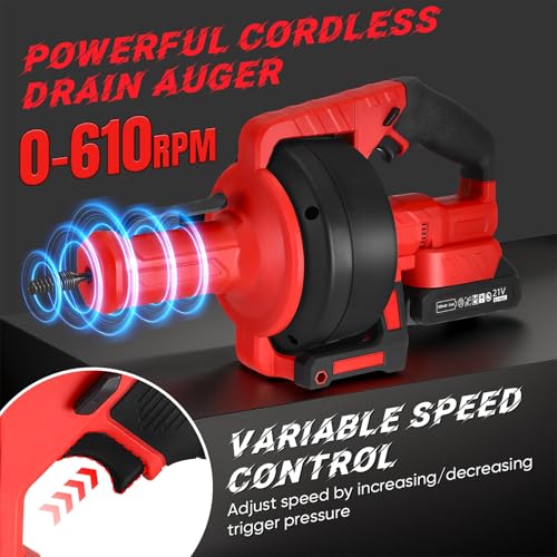 - 【High-efficiency and Powerful Motor】: Our Cordless Electric Drain Auger is equipped with a powerful high-speed motor that can provide 610RPM per minute, offering powerful and efficient performance. Even stubborn dirt and larger blockages can be easily cleared with the integrated clockwise and anti-clockwise rotation and the locking mechanism