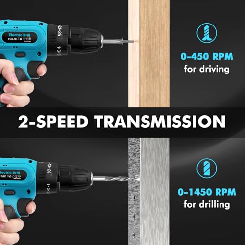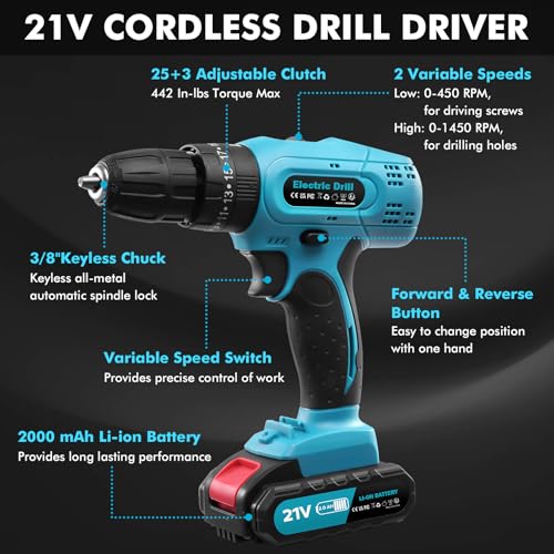• 【Versatile Drilling Performance】Experience unmatched versatility with our 21V cordless drill, featuring two speeds (0-450 RPM and 0-1450 RPM) and an adjustable clutch. Whether you're driving screws at low speed or drilling through tough materials at high speed, this tool adapts to your needs effortlessly.