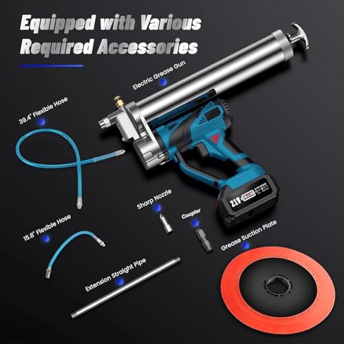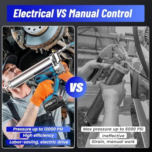 - [Excellent Performance]: With a maximum pressure of up to 10,000 PSI and a maximum flow rate of 6 ounces per minute, this cordless grease gun uses a powerful battery-powered motor to deliver grease effortlessly. The infinitely adjustable trigger allows you to precisely control the flow of grease, allowing you to control the amount of grease needed for a specific job, allowing you to optimally maintain your valuable equipment without wasting grease.