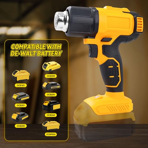 • Cordless Hot Air Gun: This cordless heat gun has a cordless design with no cord restrictions and is portable and lightweight to promote more remote locations. Compatible with Dewalt 20 V lithium-ion batteries: DCB181, DCB200, DCB201, DCB204, DCB205, DCB240, DCBP034(without Battery)