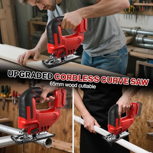 • [ Adjustable Cutting Angle]: The cordless jigsaw allows you to set different cutting angles between -45° and 45°. This means you can make straight, curved and angled cuts and drill holes. Thanks to the different saw blades, you can make precise cuts in different scenarios.