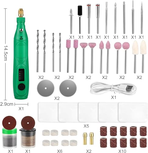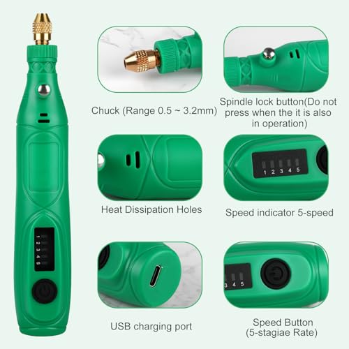 - 🔨【USB Charging】The mini rotary tool body is designed with several vent holes, which helps it to continuously dissipate the heat, for longer time-of-use. The C-type cable of rotary tool makes charging easier and takes only 1 to 1.5 hours to be fully charged,one full charge can provide multiple uses.