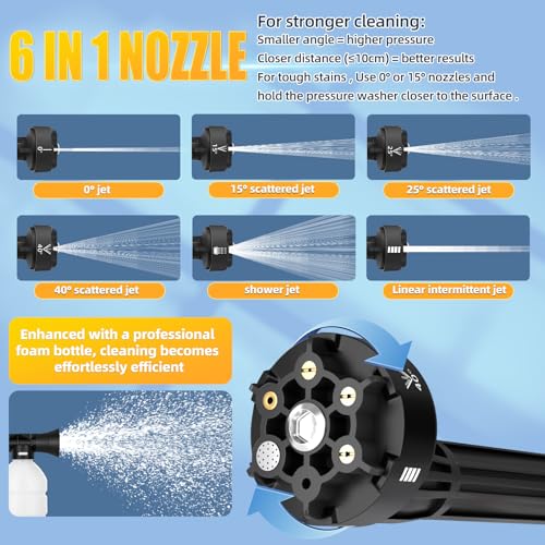 - 【6-in-1 Cordless Pressure Washer】Introducing our six-in-one nozzle pressure washer, designed for any task! With adjustable modes including 0°, 15°, 25°, 40°, shower mode, and high-pressure mode, you'll have the perfect spray for every surface. Plus, our adjustable foam pot controls foam for efficient cleaning. Easily switch angles with the rotatable nozzle, making corners a breeze. Forget complicated setups – assemble in just one minute. Upgrade your cleaning today!
