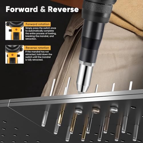 - 【ERGONOMIC & USER-FRIENDLY DESIGN】Designed with ergonomics in mind, the handle of this rivet gun provides comfort and reduces hand and forearm fatigue during extended use. The built-in LED light ensures visibility in low-light conditions, while the forward and reverse operation adds convenience to your work.