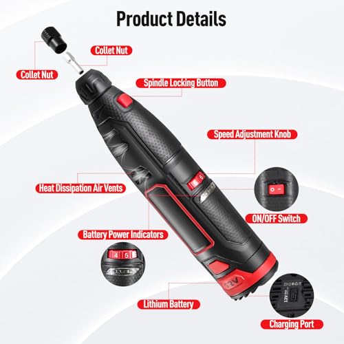 - Powerful Cordless Rotary Tool: The 12V rotary tool delivers robust performance for challenging tasks such as drilling, cutting, and carving. Equipped with a 2000mAh battery, it provides extended runtime, reducing the frequency of recharging. Its cordless design enhances mobility and flexibility, allowing effortless use in diverse environments and applications.