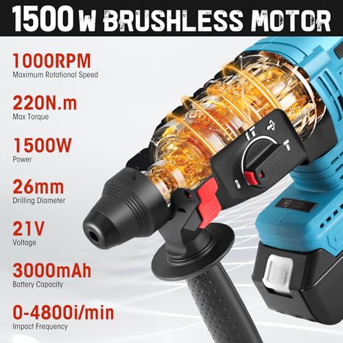 • 【BRUSHLESS MOTOR HAMMER DRILL】 – With a powerful 1500W motor, this impact brushless motor hammer drill delivers a torque of 220N.m and offers adjustable speed settings for precise operation. The impact frequency ranges from 0-4800i/min, providing powerful drilling performance. The speed setting knob and variable speed trigger allow for control over drilling speed from 0-1000 RPM, ensuring versatility for different tasks. This drill boasts a chiseling performance that is 18% higher than similar models, making it a reliable choice for your projects.
