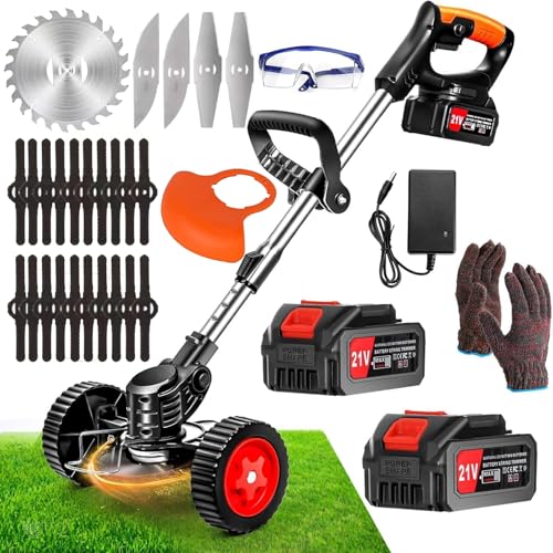 - 【Efficient and Fast Strimmer Cordless】Grass strimmer is equipped with high-power pure copper motor. Maximum speed is 18000 rpm,Strimmer cordless Powerful power makes weeding easier. The grass trimmer is battery-powered and integrates multiple functions in one: Electric strimmer, Edge trimmer, Brush cutter, easily complete different cutting jobs, not restricted by wires, you can mow the grass anywhere. battery strimmer it allows you to easily trim every nook and cranny