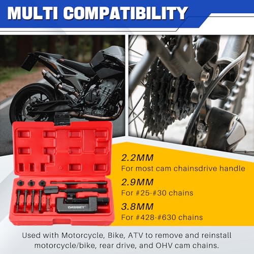 - Compatible with:This chain breaker riveter Set 13-Piece Set Could be used with Motorcycle, Bike, ATV to remove and reinstall motorcycle/bike, rear drive, and OHV cam chains. Suitable for most sizes of drive or cam chain #35 to #630 including o-rings.