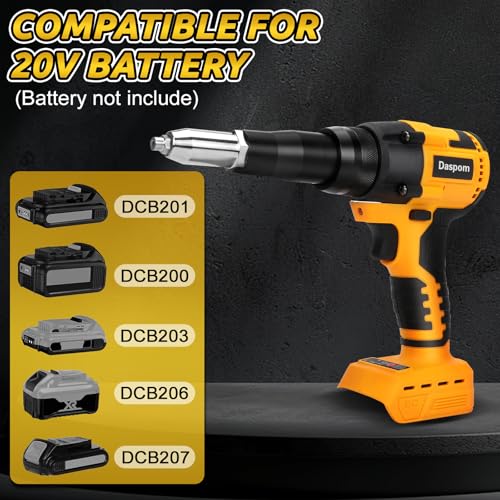 • Compatibility and Cordless: Daspom Cordless Rivet Gun compatible with Dewalt 20v lithium-ion batteries such as DCB200, DCB201, DCB203, DCB206, DCB207, and more. You can work anywhere and easily without worrying about the length of power cord. And Please noted that there were no battery and charger came with the parcel.