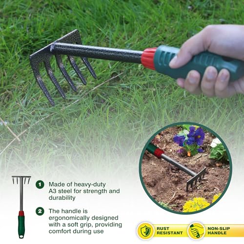 - Ergonomic Handle for Comfort: Designed with an ergonomic handle, this hand rake offers a comfortable and secure grip, minimizing hand fatigue during prolonged use. The soft, non-slip grip allows for better control and maneuverability, making it easier to navigate tight spaces in your garden or flower beds.
