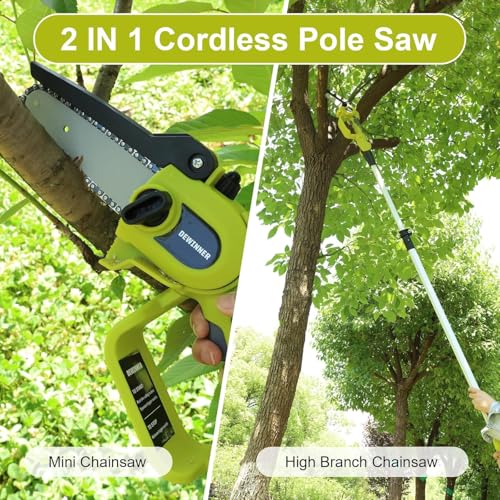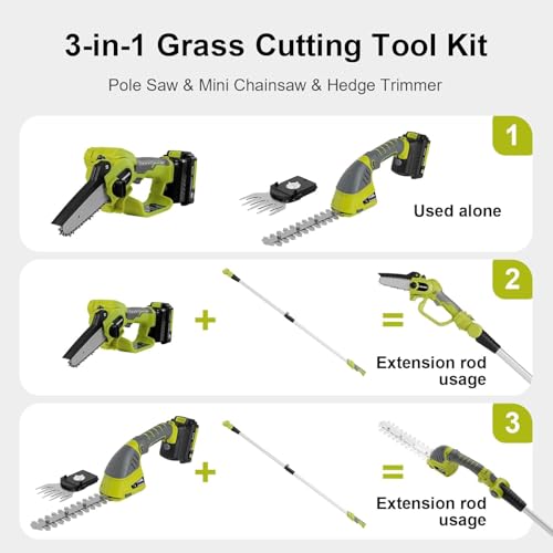 - 3-in-1 Pole & Handheld Hedge Trimmer and Chainsaw: The hedge trimmer set has 1*adjustable pole, 1*chain saw, 1* hedge trimmer, 1*quick charger, 1*detailed instructions and 1*2000mAh battery.