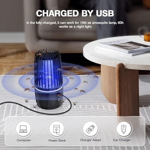 - 【Rechargeable Mosquito Trap】This upgraded fly trap bug zapper is user-friendly and only use one button to control the entire unit. The electric fly killer is equipped with a 2000mAh rechargeable battery and charged by USB cable. Full charging time is about 3hrs. It can last up to 16 hours when using bug zapper mode, and around 60 hours for lighting mode.