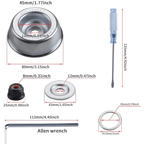 • *Package Include: 2 blades and 2 sets of adapter kits: 1 x thrust washer (10 teeth), 1 x rider plate, 1 x collar nut (m10 x 1.0), 1 x screwdriver, 2 x attached washers and 1 x thrust plate guard washer (6 teeth), 1 x thrust washer, 1 x rider plate, 1 x lock nut (m10 x 1.25), 1 x L-wrench.