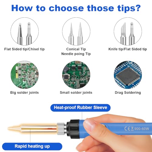 - 【COMPLETE SOLDERING IRON 8 KIT】Includes 60W soldering iron, 5 different soldering iron tips, 10g solder wire, soldering iron holder sponge and instructions ( please wet the sponge when using), to meet daily welder needs. It can be widely used in equipment maintenance, computer hardware, and jewelry making. Whether you are a welder or a beginner, these tools will suit your needs.