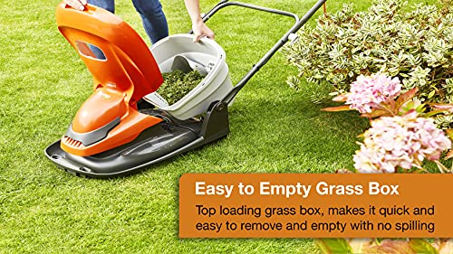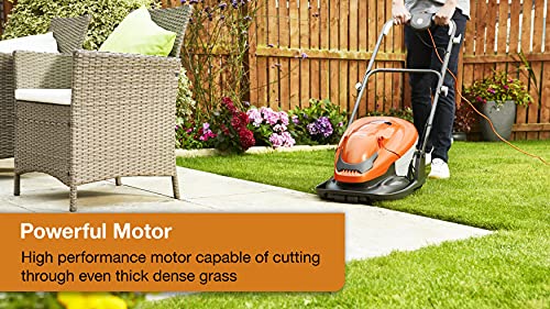- It’s 10m cable gives you the freedom and flexibility to move around your garden area, without the need to worry about reach, and the flat folding handles allow the mower to hang up on the wall for space saving storage after use.
