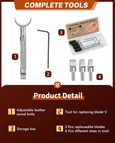 - Leather Swivel Knife: This leather carving tooling includes a 9.5cm/3.74in leather rotary cutter and 3 different sizes of replaceable blades, a total of 4 sizes of blades, and tool for replacing blades. This leather swivel engraving knife is a professional choice for beginners and an ideal choice for leather lovers