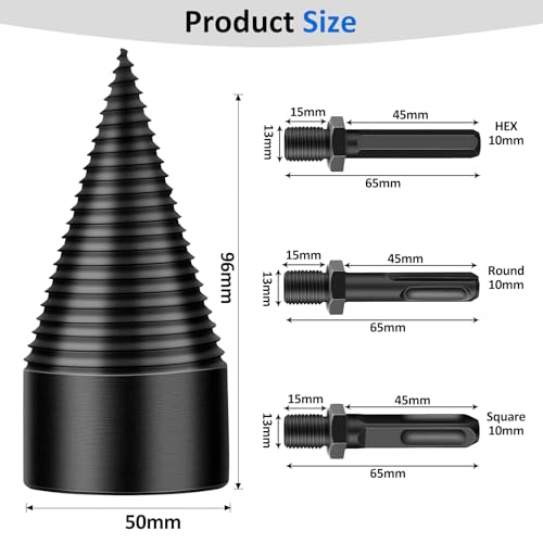 • 3 Modes Drill Bits – You will receive 50mm firewood splitter drill bits and 3 handles( Square + Round + Hex Shank). Different models are available to meet the requirements of different drills and sizes. Note: 32mm firewood log splitter requires a 750w or higher electric drill, 42mm firewood log splitter requires a 1000w or more electric drill.