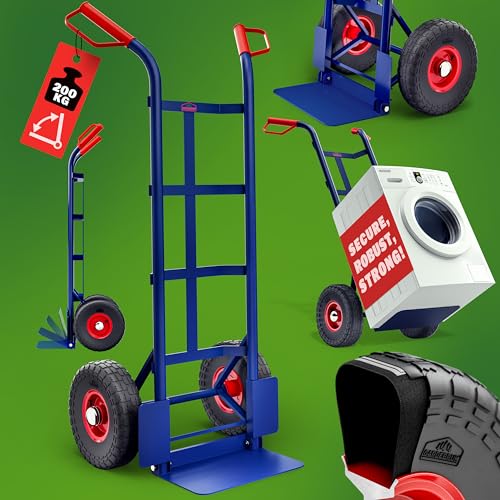 - ROBUST & DURABLE: Benefiting from a sturdy build, the hand truck can be loaded with a weight of up to 200 kg. Crafted from resilient steel, the trolley's robust construction is complemented by safety handles that ensure a comfortable and ergonomic grip.