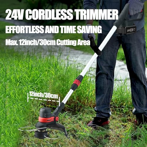 - GRASS STRIMMER CORDLESS WITH DOUBLE SAFETY DESIGN: Cordless Strimmer is equipped with 2 safety locks to prevent accidental start. The edge guide and widened splash guard prevent grass clippings and small stones from splashing out, making it safer than other Strimmer