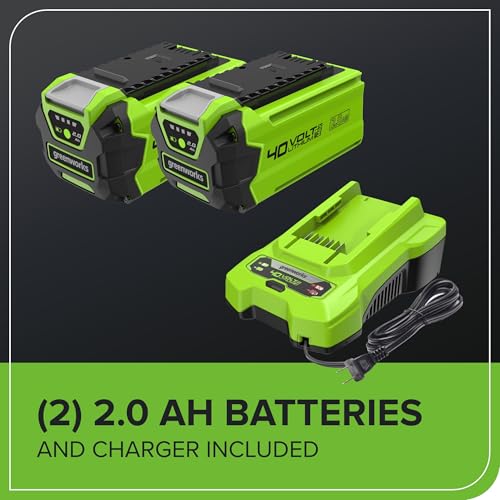 - 2 x NEW GENERATION LITHIUM 40V 2Ah BATTERIES – technologically advanced batteries that you can use in any Greenworks 40V tool to cut waste, save money and storage space