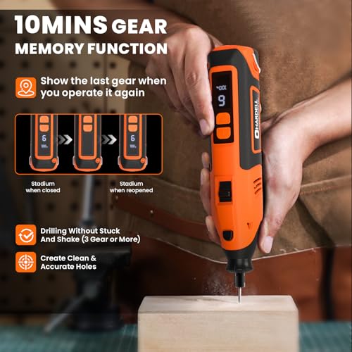 • 【Smart LCD Display】 Monitor your work effortlessly with the large LCD screen, displaying speed level, battery percentage, and charging status. The 10-minute memory function recalls your last speed setting, allowing seamless resumption of tasks with this cordless rotary tool