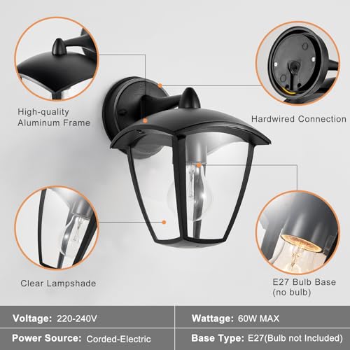 • Specifications – Height: 17 cm, Width: 21.5 cm, Depth: 23.5 cm. Our vintage outdoor wall light features an ES E27 bulb cover, compatible with E27 LED, CFL, smart bulbs, or halogen bulbs (bulbs not included, maximum power 60W).