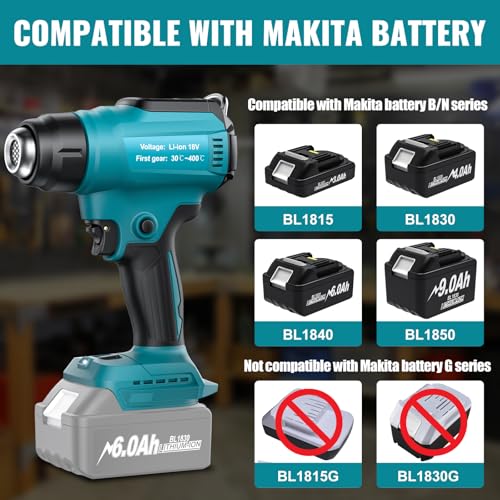 - Cordless Hot Air Gun for Makita compatible with Makita 18V LXT battery, such as BL1830 BL1840 BL1850 BL1860 BL1815 BL1820 BL1835 BL1830B BL1840B BL1850B BL1860B LXT400, etc. Attention : WITHOUT battery and charger