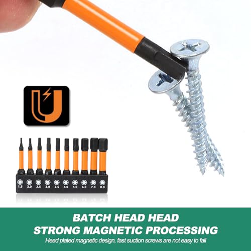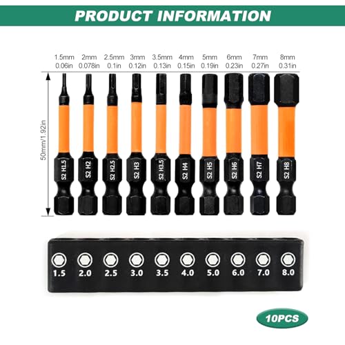 - Screwdriver Bit Sets: There are 10 different sizes of impact hex driver screwdriver bits for you to choose from, including 8mm, 7mm, 6mm, 5mm, 4mm, 3.5mm, 3mm, 2.5mm, 2mm, and 1.5mm.
